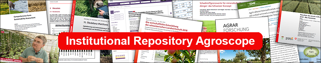 Dans l’«Institutional Repository», vous trouvez les publications des chercheuses et chercheurs d’Agroscope. Lorsque la publication est en libre accès sous forme de PDF, elle peut être téléchargée. Si ce n’est pas le cas, à l’aide de la référence de la publication, vous pouvez voir où elle a été publiée.